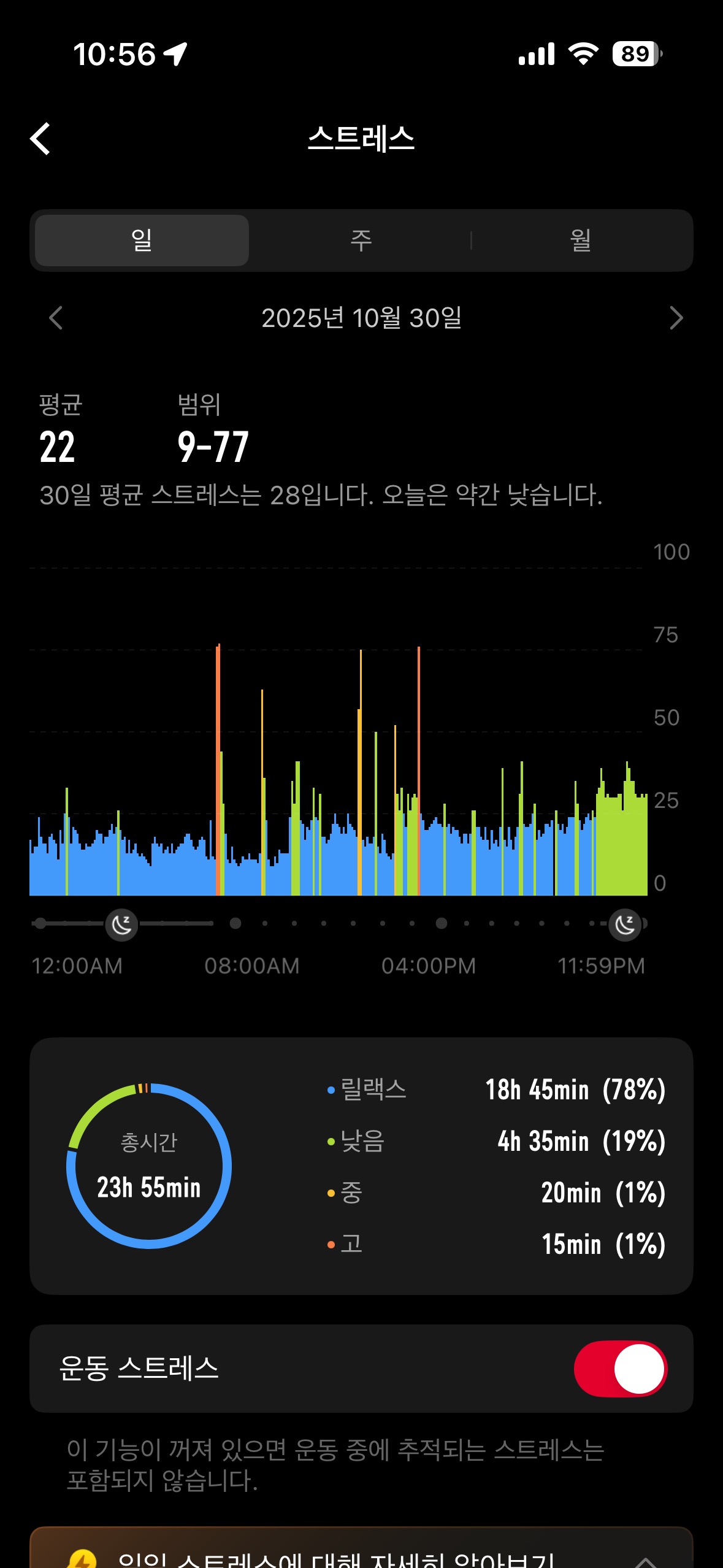 그제 아내가 소음 때문에 잠을 설쳤다고 했었는데 전 못들어서 뭔가 싶었습니다. 어제는 자기 전에 책을 읽다 보니 평소보다 조금 더 늦게 잠에 들었습니다. 불끄고 누워 있는데 밤 10 시부터 소음이 발생하더군요. 아 이게 아내가 말한건가 싶었습니다. 소음 들으면서 자려고 노력하는데 심박이 올라가는게 느껴지더군요. 적당히 무시하고 자려고 노력하다 잠에 들었고 일어나서 해당 시간대 스트레스 지수를 봤는데 평소보다 높게 올라오더군요. 소음이 스트레스를 유발한다는 연구도 많고 해서 이미 알고 있긴 했지만 스트레스를 연속적으로 측정해주는 워치로 직접 보니 새롭네요.